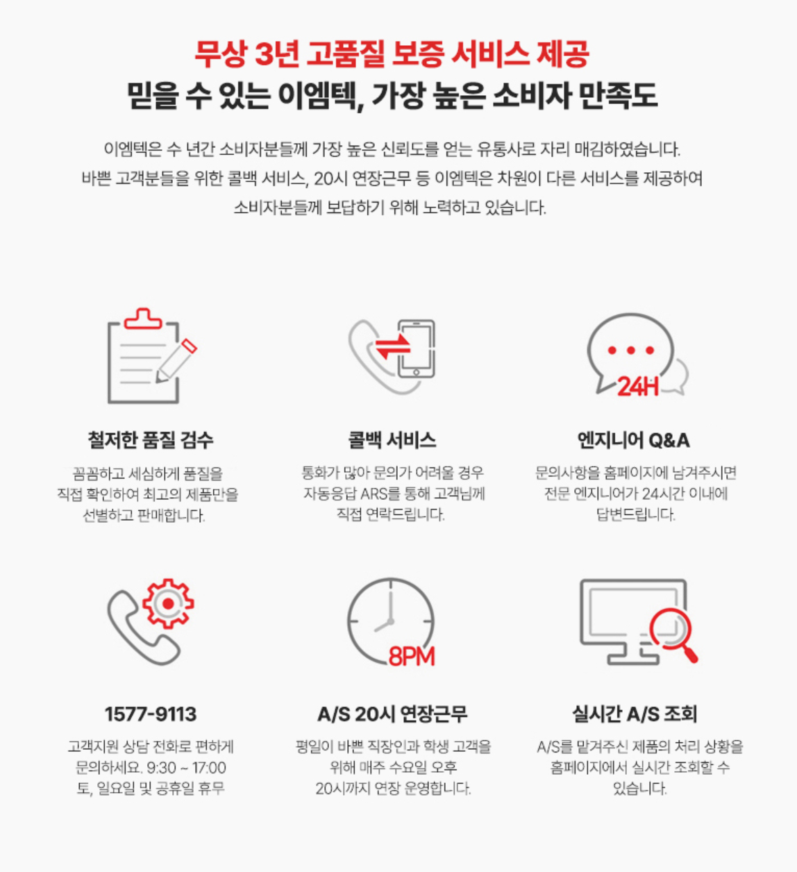 이엠텍 서비스는 참 좋습니다. A/S 연장근무도 있구요 . 방문하셔서 편하게 점검 받으시면 됩니다