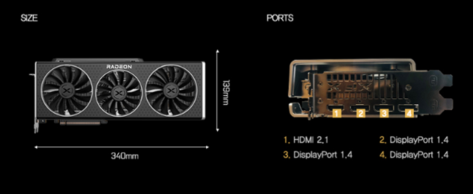 RX 6950 XT / 베이스클럭: 2009MHz / 부스트클럭: 2368MHz / 스트림 프로세서: 5120개 / PCIe4.0 / GDDR6(DDR6) / 출력단자: HDMI2.1 , DP1.4 / 부가기능: 제로팬(0-dB기술) , 8K 지원 , 4K 지원 , HDR 지원 , Dual BIOS / 정격파워 850W 이상 / 전원 포트: 8핀 x2 / 3개 팬 / 가로(길이): 340mm / 두께: 57mm / 백플레이트 / A/S 3년