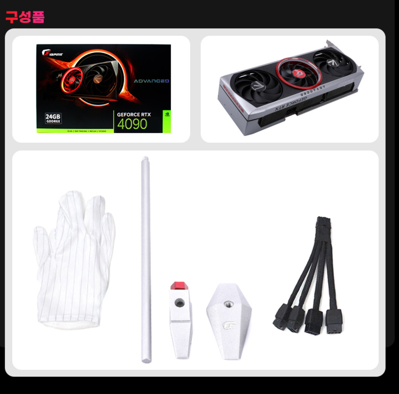 RTX 4090 / 4nm / 베이스클럭: 2235MHz / 부스트클럭: 2610MHz / 스트림 프로세서: 16384개 / PCIe4.0x16 / GDDR6X(DDR6X) / 출력단자: HDMI2.1 , DP1.4 / 부가기능: 제로팬(0-dB기술) , 8K 지원 , 4K 지원 , HDR 지원 , HDCP 2.3 / 사용전력: 최대 520W / 정격파워 1000W 이상 / 전원 포트: 16핀(12VHPWR) x1 / 전원부: 20+4페이즈 / 3개 팬 / 가로(길이): 343.8mm / 두께: 70.5mm / 백플레이트 / LED 라이트 / 오버클럭 물리키 / 구성품: VGA지지대, 4x8핀 to 16핀 커넥터 / A/S 3년