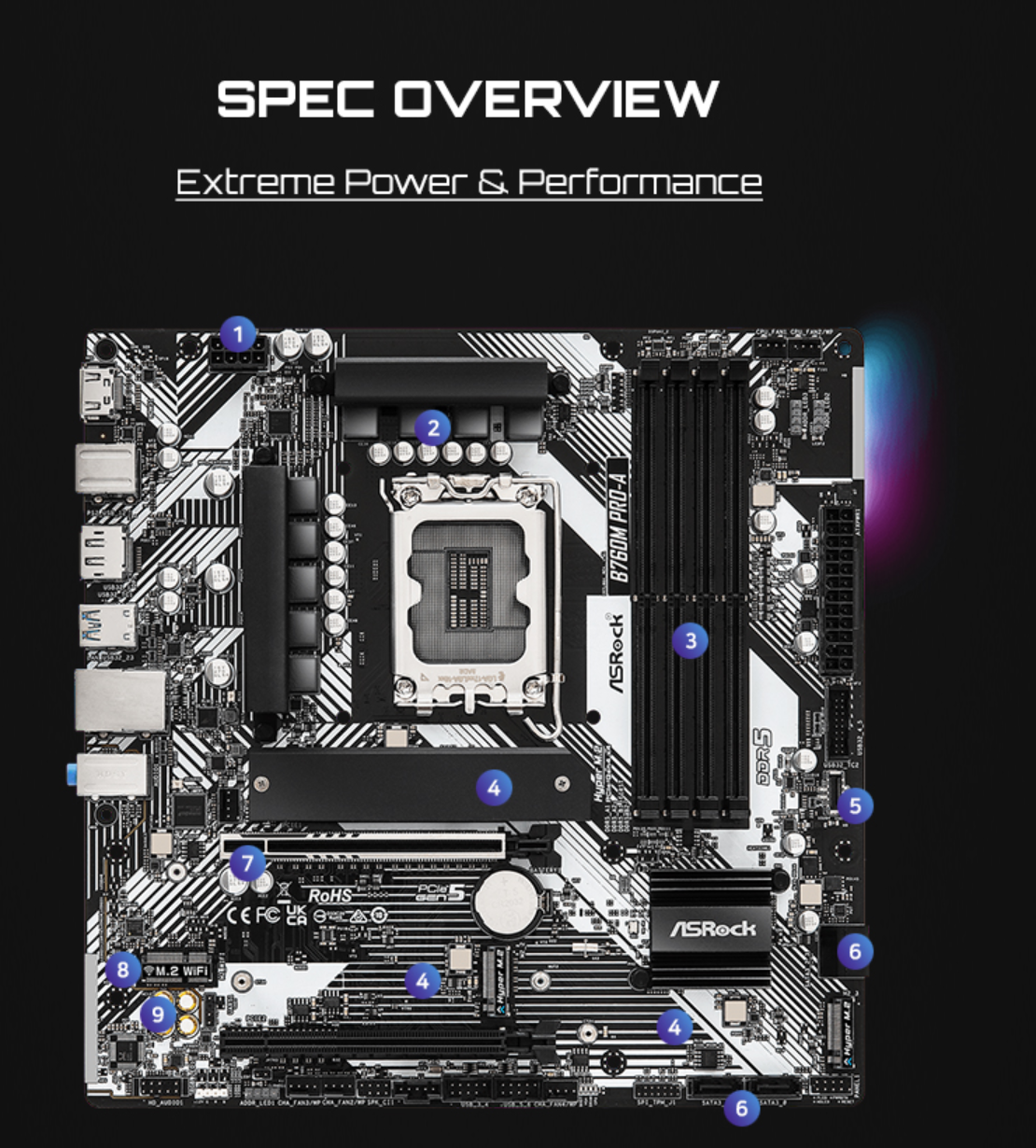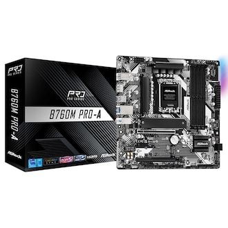 인텔(소켓1700) / 인텔 B760 / M-ATX (24.4x24.4cm) / 전원부: 7+1+1페이즈 / 메모리 DDR5 / 7200MHz (PC5-57600) / 4개 / 메모리 용량: 최대 192GB / XMP / EXPO / 확장슬롯 VGA 연결: PCIe5.0 x16 / PCIe버전: PCIe5.0 / PCIex16: 1개 / PCIex16(at x4): 1개 / 저장장치 M.2: 3개 / SATA3: 4개 / M.2 연결: PCIe4.0, NVMe / 후면단자 HDMI / DP / USB 3.0 / USB 2.0 / RJ-45 / 오디오잭 / PS/2 / 랜/오디오 유선랜 칩셋: Realtek RTL8125BG / 2.5기가비트 / RJ-45: 1개 / M.2 Key-E(모듈별매) / 오디오 칩셋: Realtek ALC897 / 내부I/O I/O 헤더: 썬더볼트4 헤더 , USB 3.0 헤더 , USB 2.0 헤더 , USB3.0 Type C 헤더 , RGB 12V 4핀 헤더 , ARGB 5V 3핀 헤더 , TPM 헤더 / 시스템팬 4핀: 4개 / USB2.0 헤더: 2개 / USB3.0 헤더: 1개 / 특징 전원부 방열판 / DrMOS / M.2 히트싱크 / LED 라이트 / UEFI