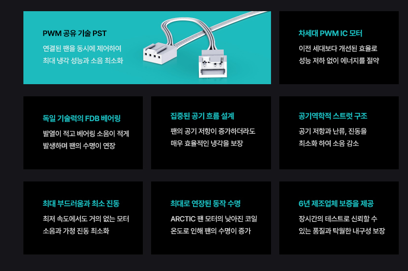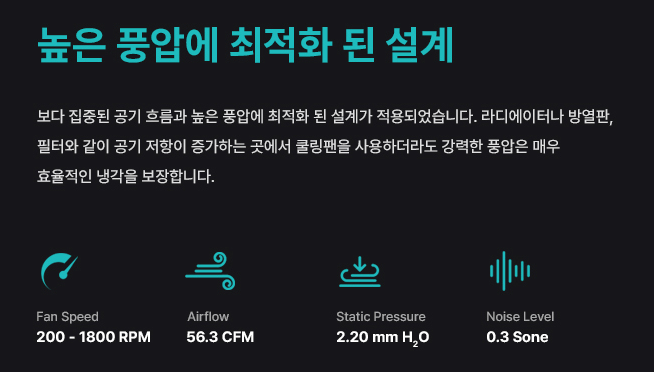 시스템 쿨러 / 팬 쿨러 / A/S기간: 6년 / 무게: 145g / 팬 크기: 120mm / 팬 개수: 5개 / 25T / 4핀 / 베어링: FDB(유체) / 1800 RPM / 최대 풍량: 56.3 CFM / 풍압(정압): 2.2mmH₂O / PWM 지원 / 제로팬(0-dB기술) / non-LED