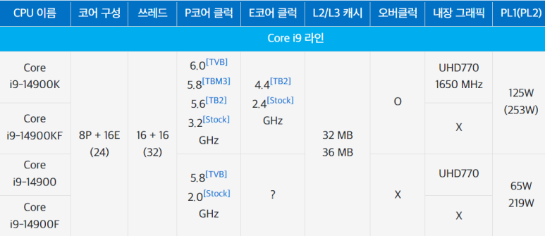 14900 KF 오버클럭 O 내장 X