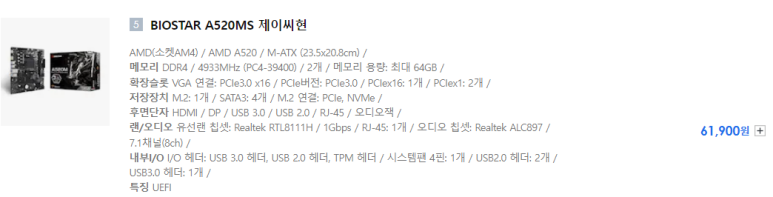 바이오스타입니다. 생체별이지만 B450보다는 A520이 최신이 아닐까 하며 제가 최근에 효도컴에 집어넣은 친구입니다. 생각보다 성능은 괜찮더라구요 as도 3년인만큼 최저가 라인업에서 조금이라도 더 절감 가능합니다.