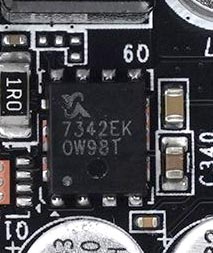 SinoPower의 SM7342EKKP 칩셋. 상 모스펫과 하 모스펫이 하나로 합쳐진 Dual N-Channel 제품