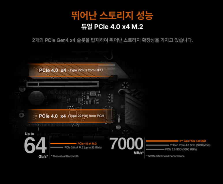 M.2 NVMe SSD 4.0 2개 장착 가능하며 SATA3: 4개 장착가능 하다고 하네요.