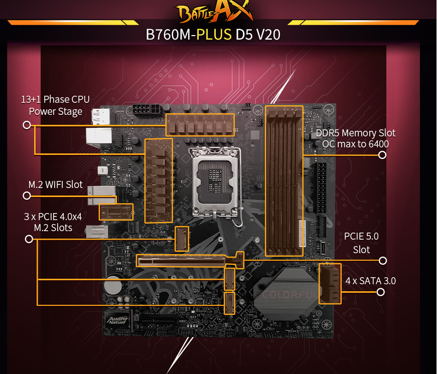 인텔(소켓1700) / 인텔 B760 / M-ATX (24.5x24.5cm) / 전원부: 13+1 페이즈 / 메모리 DDR5 / 6400MHz (PC5-51200) / 4개 / 메모리 용량: 최대 128GB / XMP / 확장슬롯 VGA 연결: PCIe5.0 x16 / PCIe버전: PCIe5.0, PCIe3.0 / PCIex16: 1개 / PCIex4: 1개 / 저장장치 SATA3: 4개 / M.2: 3개 / NVMe / PCIe4.0 / 후면단자 HD