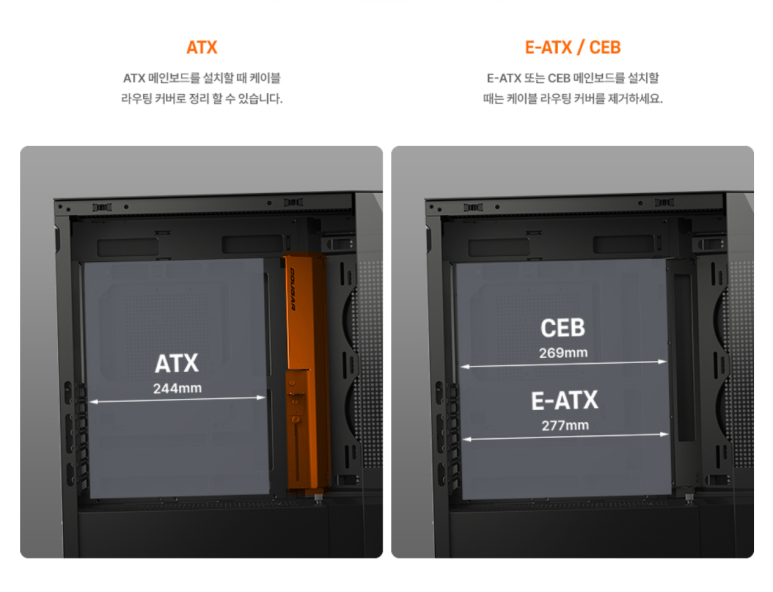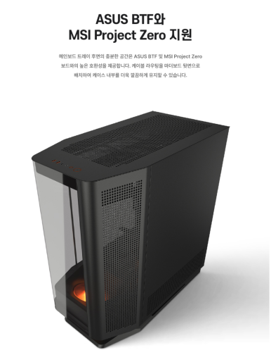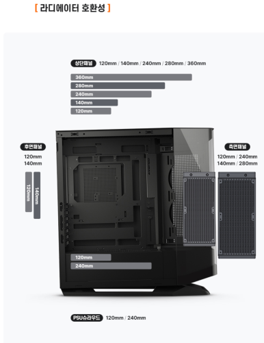 E-ATX까지 장착가능하고 쿨링팬은 하나 지원합니다. 크기가 큰 만큼 얼추 다 들어갑니다. 호환 생각없이 하셔도 됩니다. 그래픽은 420mm까지