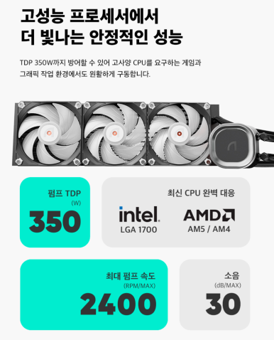 CPU 쿨러 / 수랭 / 팬 쿨러 / TDP: 350W / A/S기간: 팬1년+누수보상5년 / [호환/크기] 인텔 소켓: LGA1700, LGA1200, LGA115x , LGA2066 , LGA2011-V3 , LGA2011 / AMD 소켓: AM5, AM4 , FMx/AMx(AM1제외) / [수랭] 라디에이터: 3열 / 라디에이터 길이: 397mm / 라디에이터 두께: 27mm / [쿨링팬] 팬 크기: 120mm / 팬 개수: 3개 / 25T / 베어링: Hydraulic(유체) / 2400 RPM / 최대 풍량: 74.07 CFM / 풍압(정압): 3.15mmH₂O / 최대 팬소음: 35.2dBA / 작동전압: 팬 12V, LED 5V / [부가기능] LED 라이트 / PWM 지원 / 데이지체인 / RGB / LED시스템: AURA SYNC, MYSTIC LIGHT, RGB FUSION, POLYCHROME, CHROMA / [구성품/기타] 써멀유형: 주사기형
