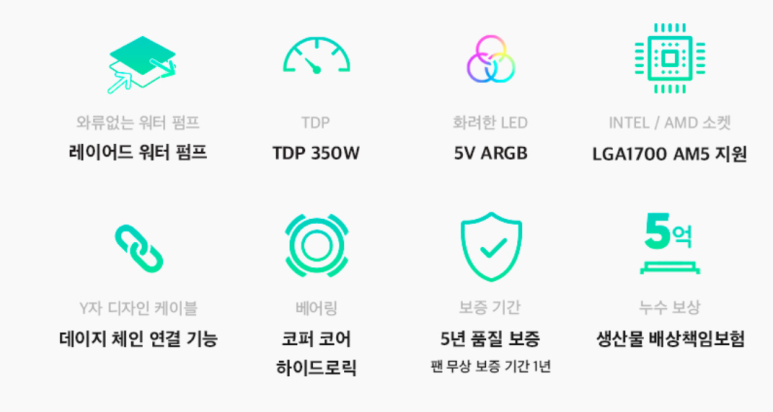 TDP 350W 좋아보이지만 팬 1년.. 아쉽습니다. 라디 길이는 397mm 두께 27mm로 기본 360수냉 호환 쿨러들은 호환 가능해 보입니다.