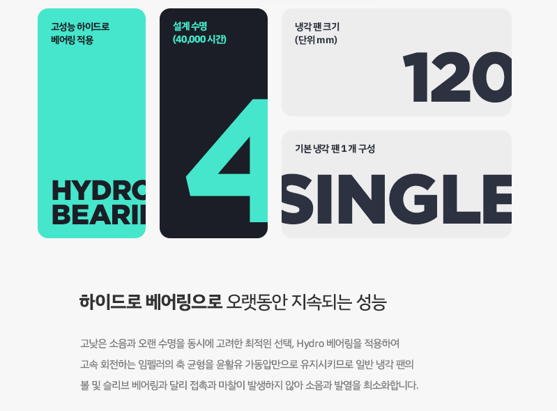 하이드로 베어링으로 내구성을 보장한 팬입니다. 4만시간의 설계수명은 하루에 10시간씩 켠다고 가정할 때