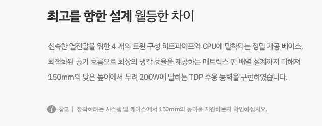 CPU 쿨러 / 타워형 / 공랭 / LGA1700 / LGA1200 / LGA115x / AM5 / AM4 / TDP: 200W / 쿨러 높이: 150mm / 무게: 614g / 팬 쿨러 / 팬 크기: 120mm / 25T / 4핀 / 베어링: Hydro / 2000 RPM / 최대 풍량: 75.89 CFM / 최대 풍압: 2.53 mmH2O / 최대 소음도: 최대 31.6dBA / PWM 지원 / 1년 / CPU쿨러 최대높이 (약 150mm)